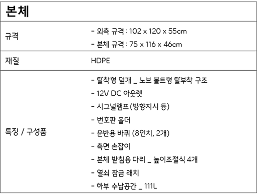 또한 본체 케이스의 덮개는 노브 볼트로 쉽게 탈부착이 가능하여 필요시 야외 테이블로도 활용 할 수 있어 여러분의 아웃도어를 보다 편리하고 다양하게 만들어 드립니다.